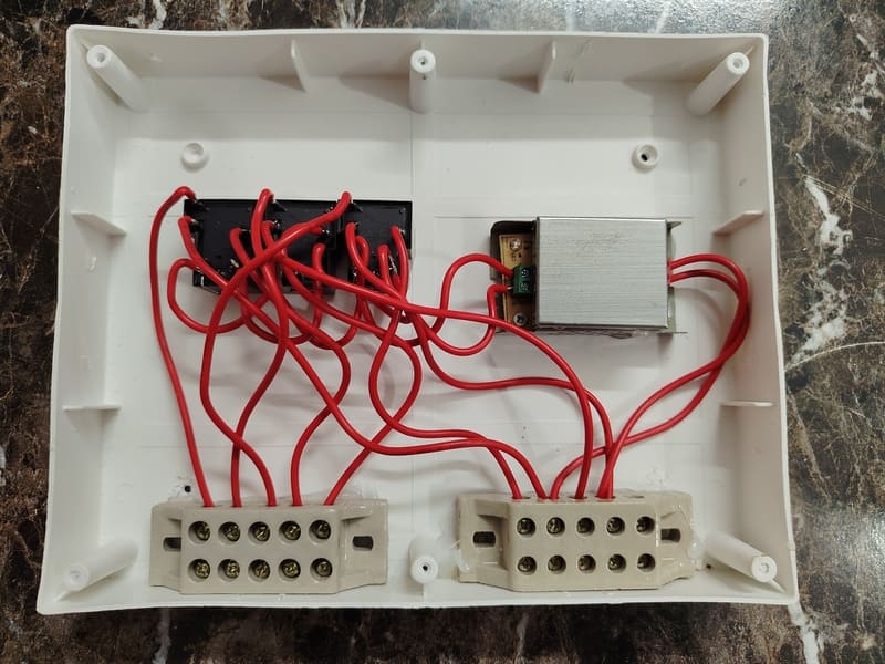- Place the relays and power supply inside the box one by one.